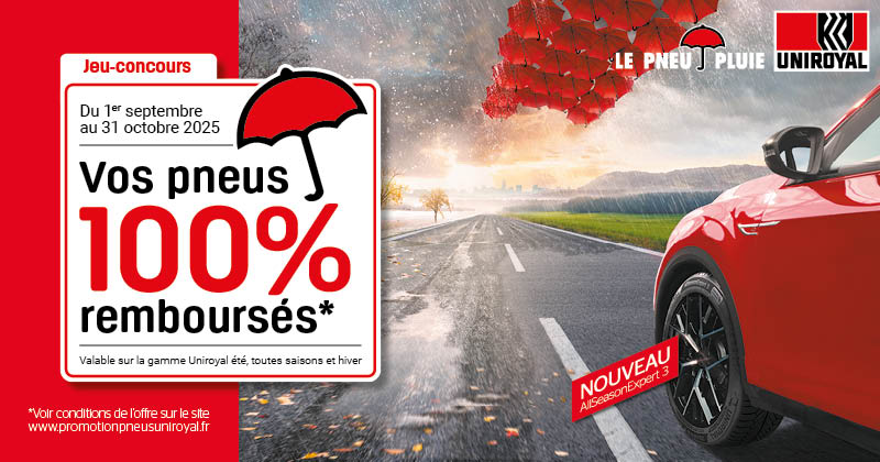 Pour participer au tirage au sort, achetez 2 ou 4 pneumatiques de la marque UNIROYAL (tourisme, 4×4 ou camionnette).