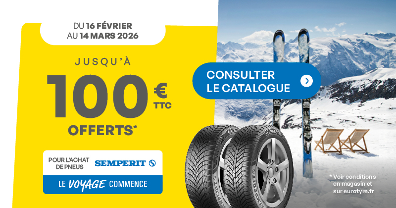 Le voyage commence ! Du 16 février au 14 mars 2026, profitez de notre offre jusqu’à 100€ offerts* pour l’achat de pneus Semperit.